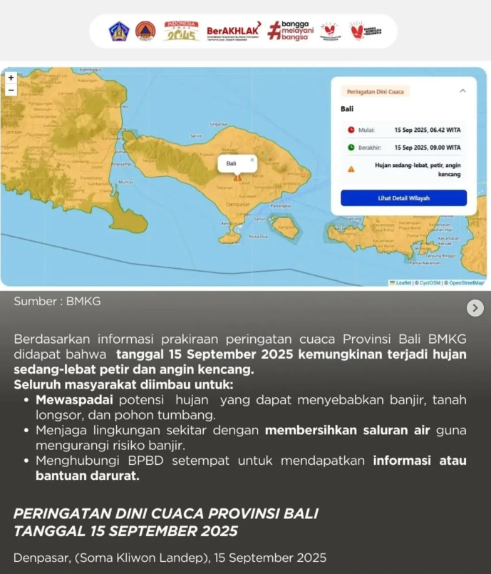 Badan Penanggulangan Bencana Daerah (BPBD) Provinsi Bali mengumumkan peringatan dini cuaca untuk Senin, 15 September 2025, berdasarkan informasi prakiraan dari BMKG yang menunjukkan potensi hujan intensitas sedang hingga lebat disertai petir dan angin kencang di sejumlah wilayah Pulau Dewata. Rilis resmi BPBD di Denpasar menekankan bahwa pola cuaca berintensitas tinggi dalam kurun pendek dapat memicu bencana hidrometeorologi seperti banjir, genangan, tanah longsor, hingga pohon tumbang, terlebih pada kawasan dengan kontur terjal, drainase tidak memadai, dan ruang terbuka yang dipadati aktivitas warga. Dengan mempertimbangkan karakter cuaca yang cepat berubah, BPBD meminta masyarakat, pelaku usaha, pengelola destinasi wisata, serta pengendara untuk meningkatkan kewaspadaan sepanjang hari—terutama pada jam-jam rawan hujan lebat—seraya memperbarui informasi cuaca resmi. Peringatan ini juga menyasar aktivitas luar ruang yang rentan terhadap kilat/petir dan hembusan angin kencang: nelayan dengan kapal kecil, pekerja proyek ketinggian, petani di lahan terbuka, komunitas pesepeda, hingga pengunjung pantai diimbau menunda kegiatan ketika awan konvektif pekat mulai terbentuk. Pengguna jalan diminta mengatur rute alternatif dan menjaga jarak aman antarkendaraan, menghindari melintas di bawah baliho dan pepohonan besar saat hembusan angin meningkat, serta tidak memaksa menerobos genangan yang menutup permukaan jalan. Sektor layanan publik—dari pengelola sekolah, kampus, rumah ibadah, pasar tradisional, hingga pusat perbelanjaan—disarankan meninjau kesiapan jalur evakuasi internal, memastikan sistem kelistrikan terlindung dari lonjakan petir, dan menyiagakan petugas kebersihan untuk menangani sampah yang berpotensi menyumbat saluran. Di lingkungan pemukiman, warga diimbau merapikan halaman, mengikat benda-benda ringan yang mudah terangkat angin, memeriksa talang dan atap rumah, serta menempatkan barang-barang penting pada posisi lebih tinggi sebagai langkah mitigasi jika terjadi rembesan air.