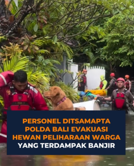 Personel Direktorat Samapta (Ditsamapta) Polda Bali melakukan evakuasi terhadap hewan peliharaan milik warga yang terdampak banjir di kawasan Jalan Bumi Ayu, Sanur, pada Selasa (24/2). Tindakan ini dilakukan sebagai bagian dari respons cepat aparat kepolisian dalam membantu masyarakat yang terdampak bencana hidrometeorologi akibat curah hujan tinggi yang melanda wilayah tersebut. Selain fokus pada keselamatan warga, petugas juga memberikan perhatian terhadap keberadaan hewan peliharaan yang berpotensi terjebak dalam genangan air maupun lingkungan yang tidak aman selama banjir berlangsung.